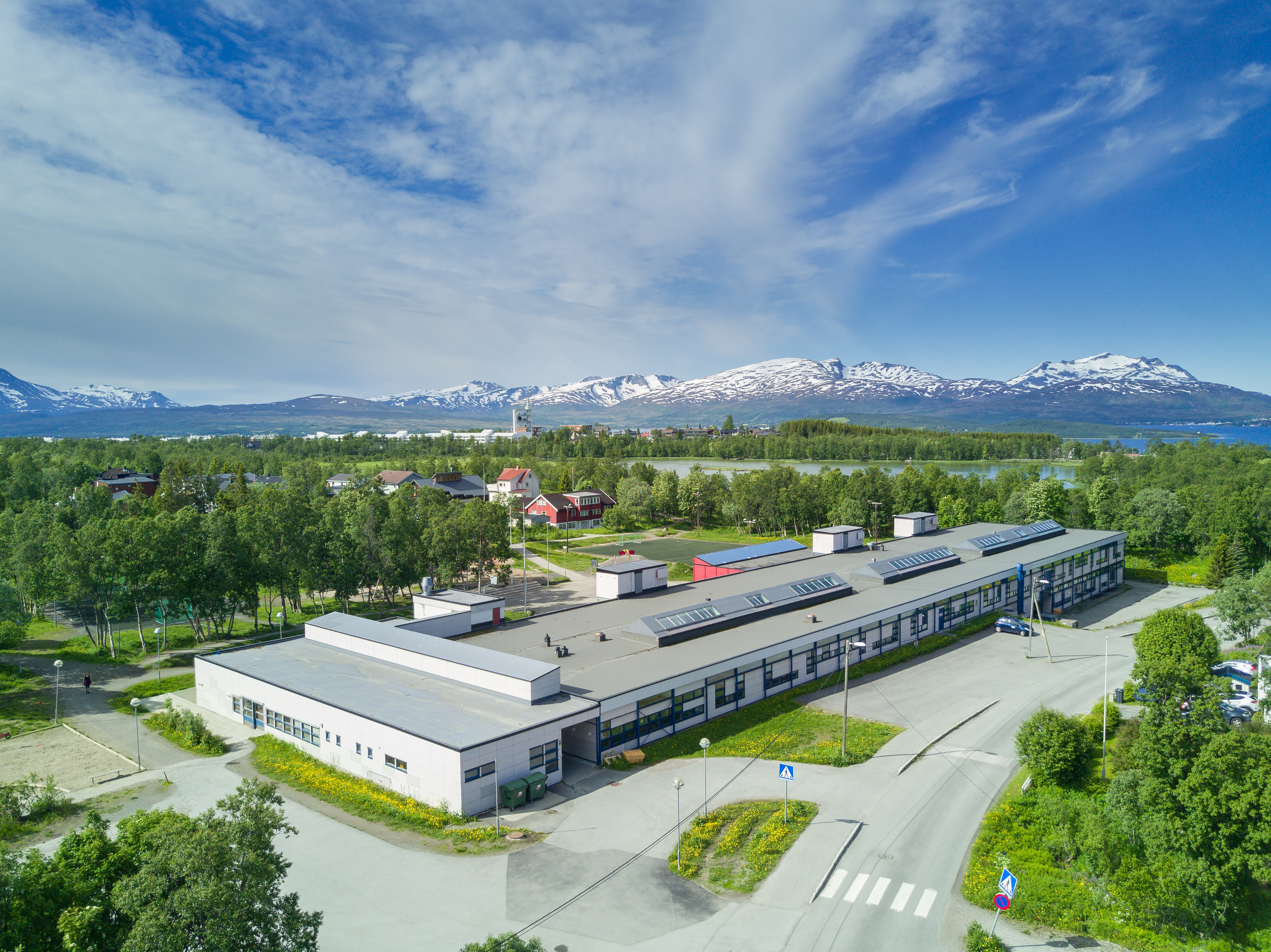 Skolen ligger omtrent midt på Tromsøya, nær nordøstbredden av Prestvannet.