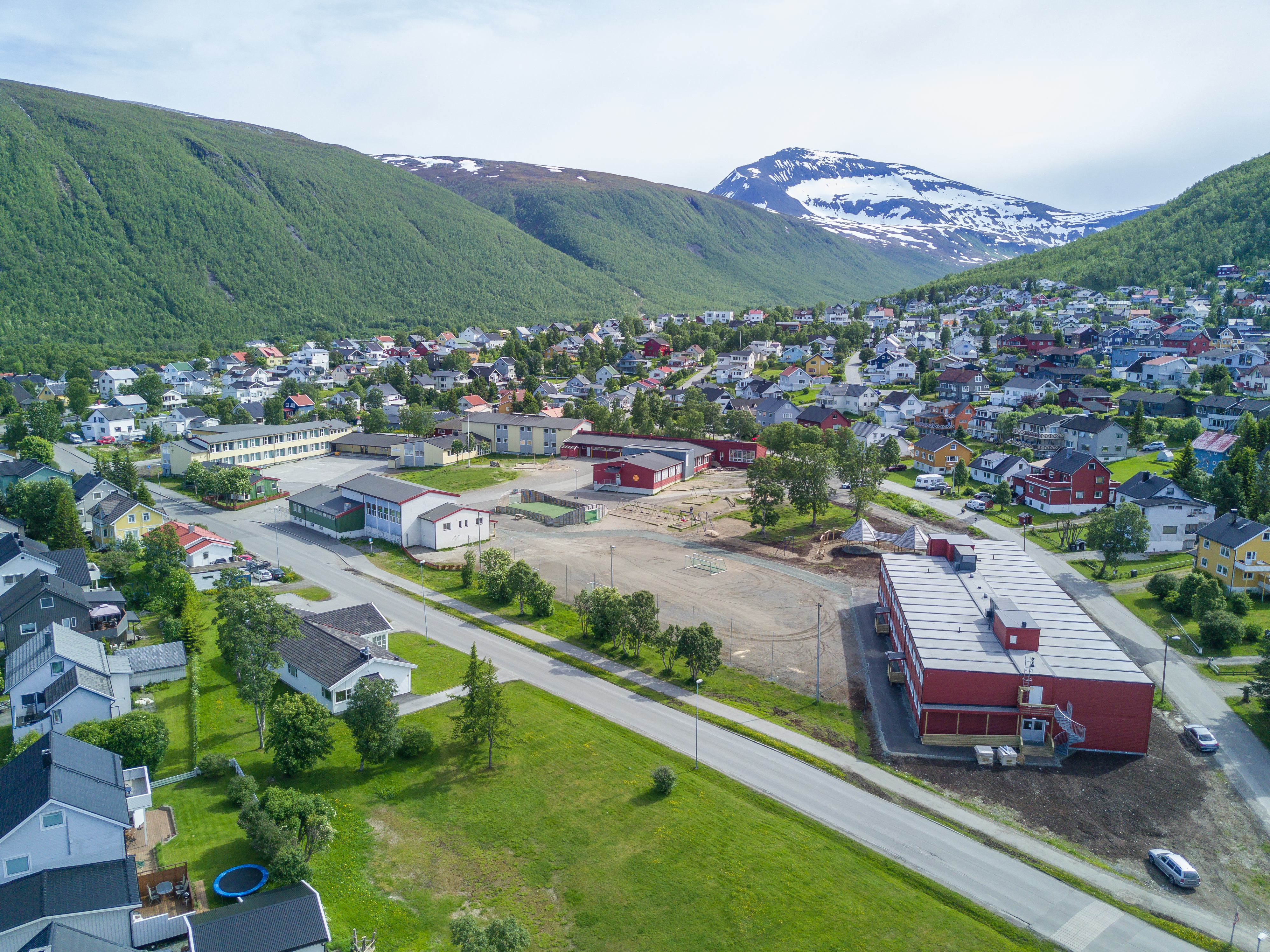 Skolen ligger på østsiden av Tromsøysundet, på fastlandet, med Ishavskatedralen som en av de nærmeste naboene.