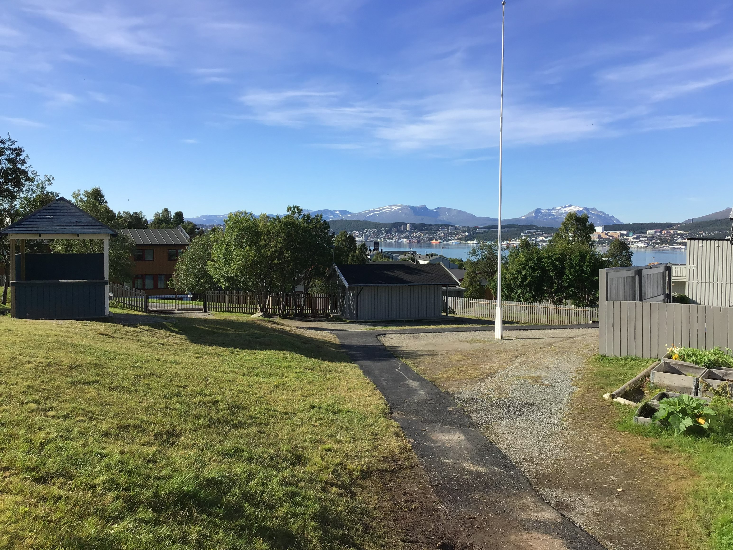 Utenfor barnehagen har vi ulike lekeapparater og et stort multihus som vi bruker hele året til samlinger og måltider. Vi har også en fin akebakke om vinteren og en liten kjøkkenhage om sommeren.