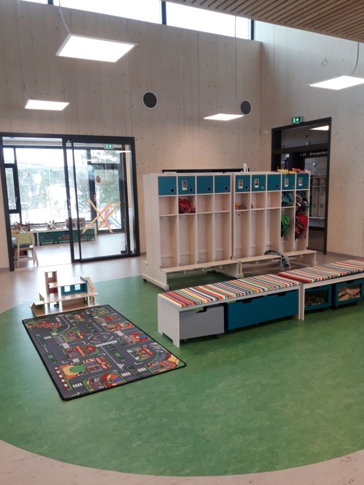 På vinteren arrangerer vi vår egen vinterfestivaluke med skigåing og vinterlek. Vi har tilgang til skolens fotballbane og gymsal som vi bruker når elevene ikke er der.