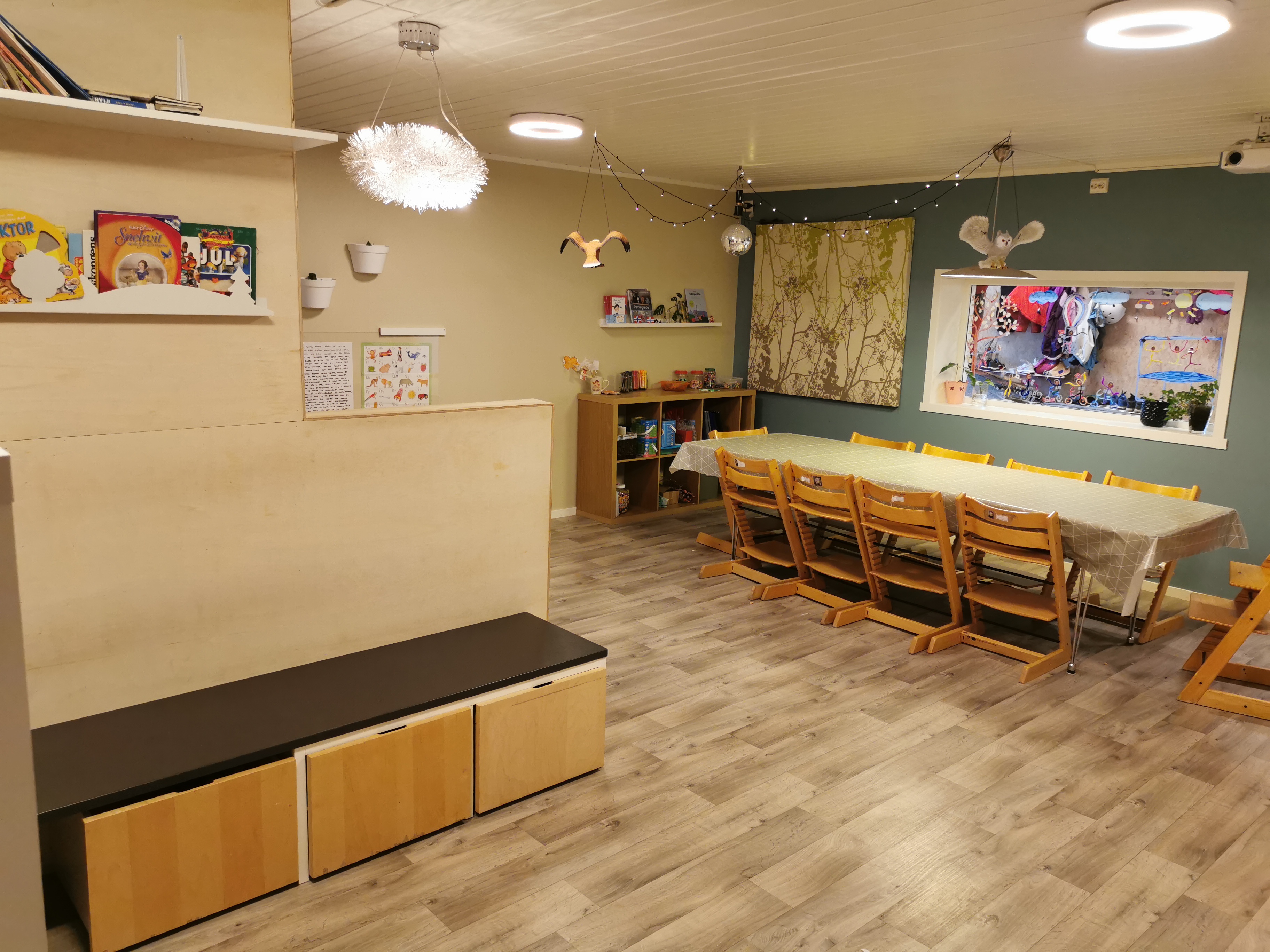 Utenfor barnehagen har vi en stor hage med lekeapparater. Vi har også et eget atelier i barnehagen.