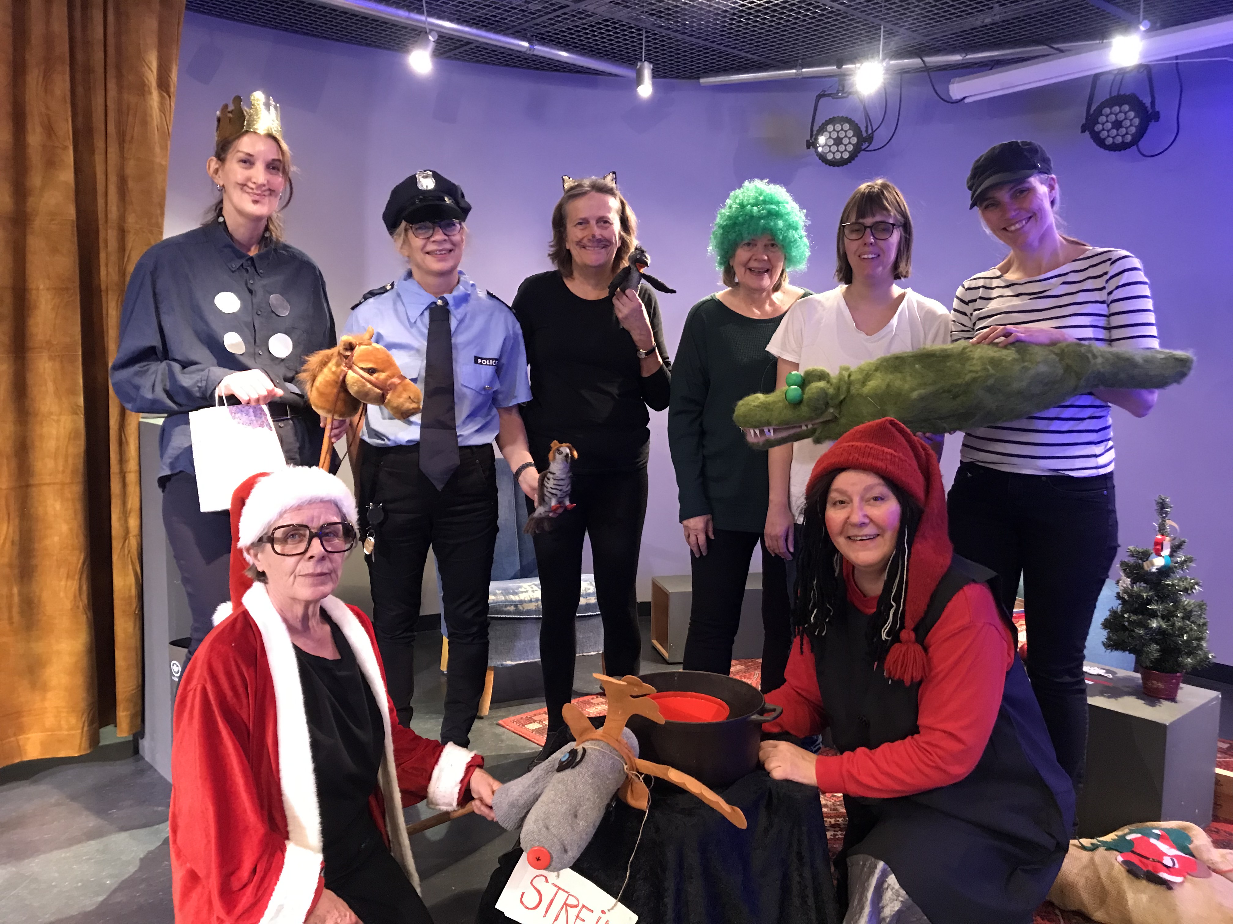 På gruppebildet ser man Drømmeprinsen, Politimannen, katten Hokus, Grønnskollingen, Frossenpinnen, Tyven, Julenissen og selveste Pulverheksa. Da hadde vi ikke flere skuespillere, så kråka Pokus, Suppegjøken, Krokodillen, hesten til Drømmeprinsen og reinsdyret til julenissen, måtte spilles av kosedyr.