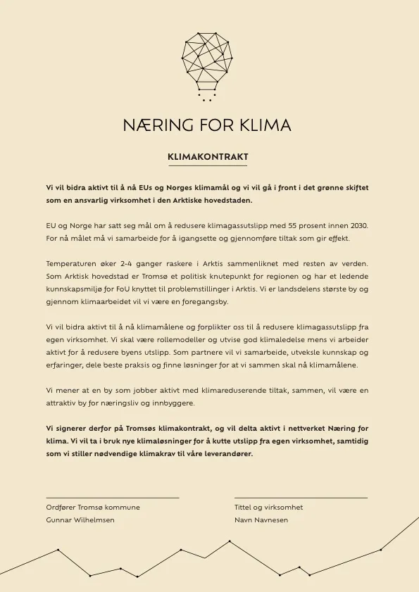 Med "Næring for klima" inviterer Tromsø kommune alle virksomheter som ønsker å redusere sine klimagassutslipp til å underskrive en klimakontrakt med ordføreren i Tromsø.