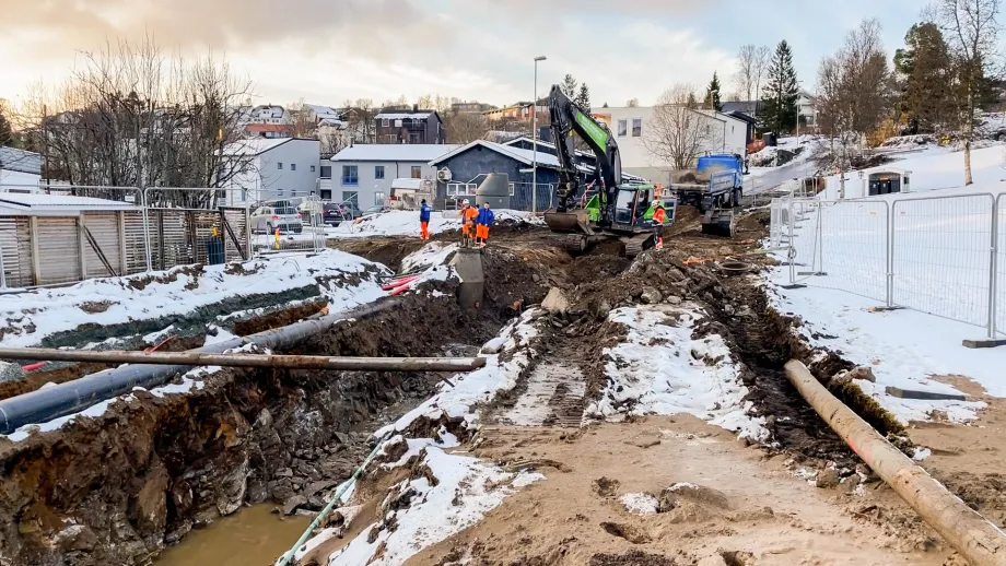 Grøfta vi ser i bildet vil flytte seg oppover i løpet av det neste året, etter hvert som rørene er bytta ut.