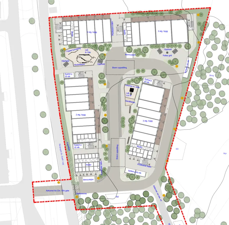 Illutstrasjoner under viser planlagt utbygging på Bymyra. Merk at dette er grove skisser som ikke er 100% ferdigbearbeidet, og at det derfor vil kunne være mindre avvik mot faktisk utbygging. Det skal totalt bygges 60 leiligheter fordelt på 13 stk 3-roms og 47 stk 2-roms.
